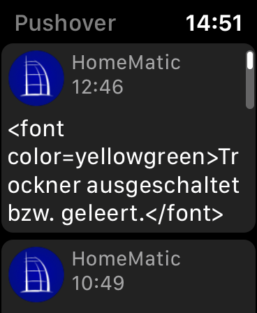 However, it seem that Pushover for watchOS (I am using watchOS 6.0.1 on an Apple Watch Series 4) is neither able to transform the respective HTML tags nor to display any attached pictures. Those pictures are only displayed for a certain period of time after reception of the respective push notification directly within the notification centre of watchOS.