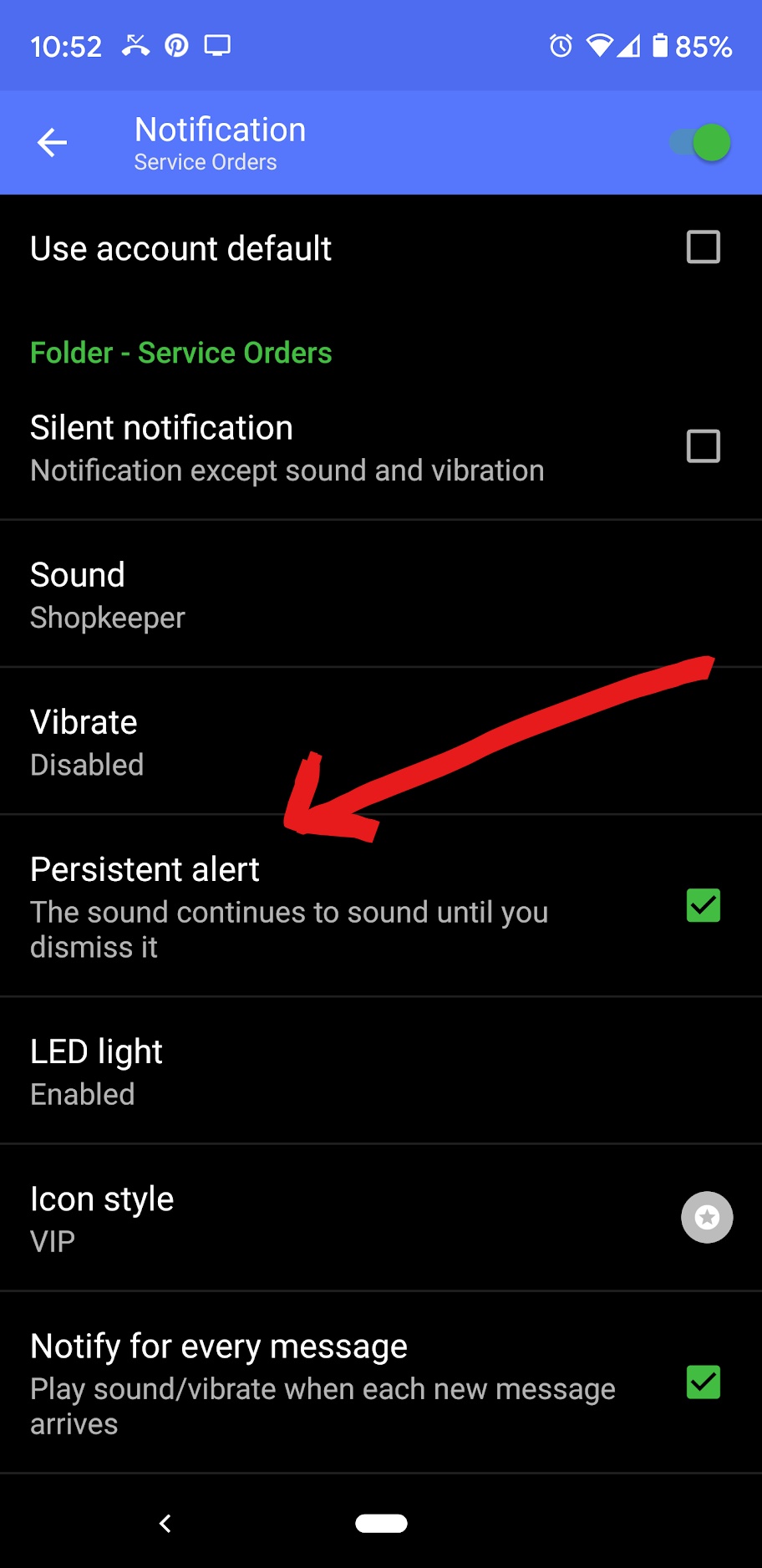 Persistent audible alerts should be an option on all devices but specifically on Android in my application (since I know it already works there). I use 9Folders Nine email app and they have an option for persistent notifications that is a game changer for employees who rely on a notification for response to contracts and work orders.